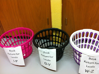 The last step to keeping the book room organized and functioning is to have a system for what will happen once the books are returned. In the back of the book room, I keep three bins labeled with three different levels of books from the book room. The teachers return the set of bagged books to the appropriate bin, and a parent volunteer stops in several days a week to return the books to the shelf. Another great development is teachers put the guided reading plan they created and used while teaching the book during guided reading right in with the bag when they return the books. This gives the next teacher that uses that set of books a starting point when creating their guided reading lesson.