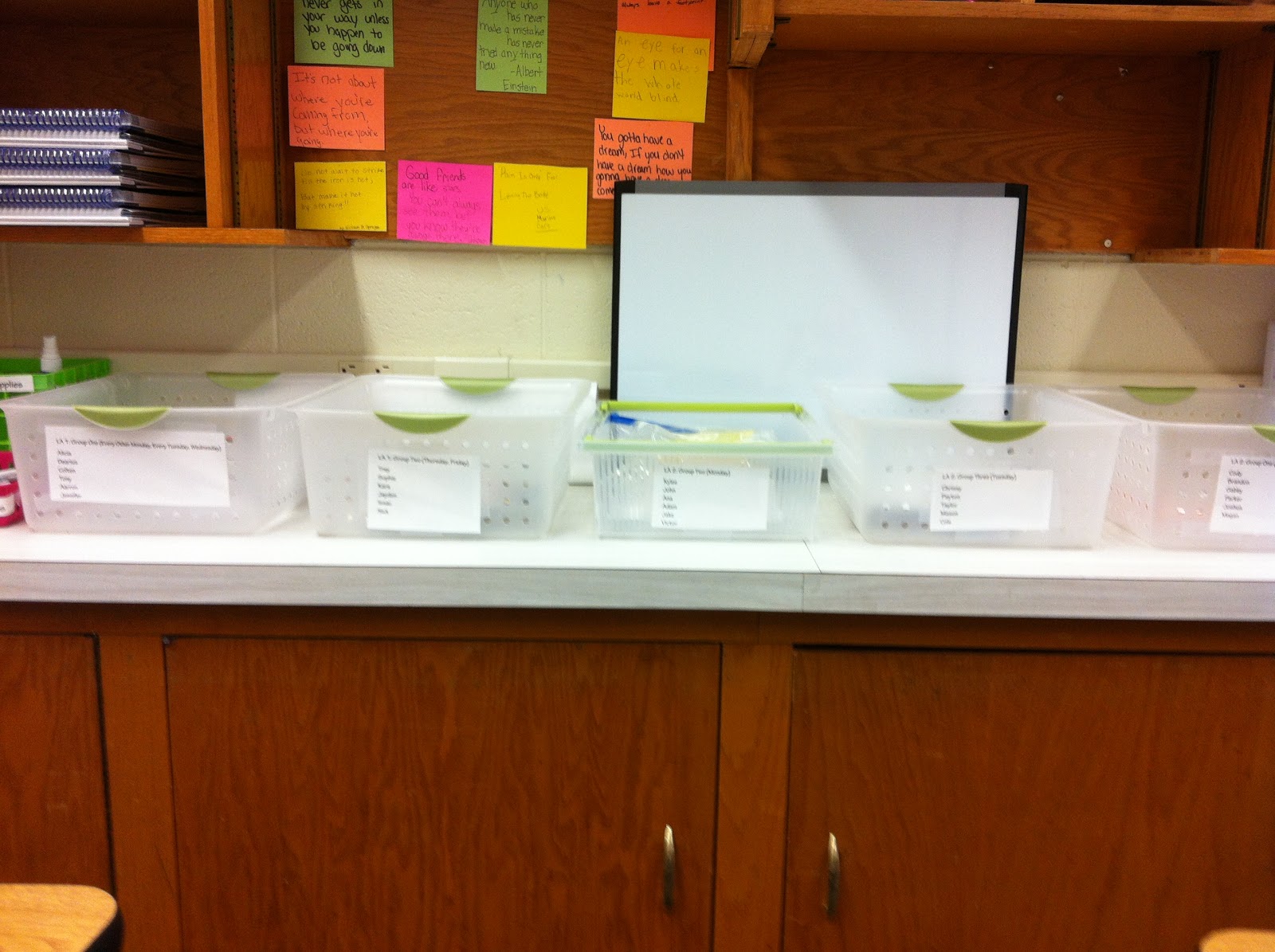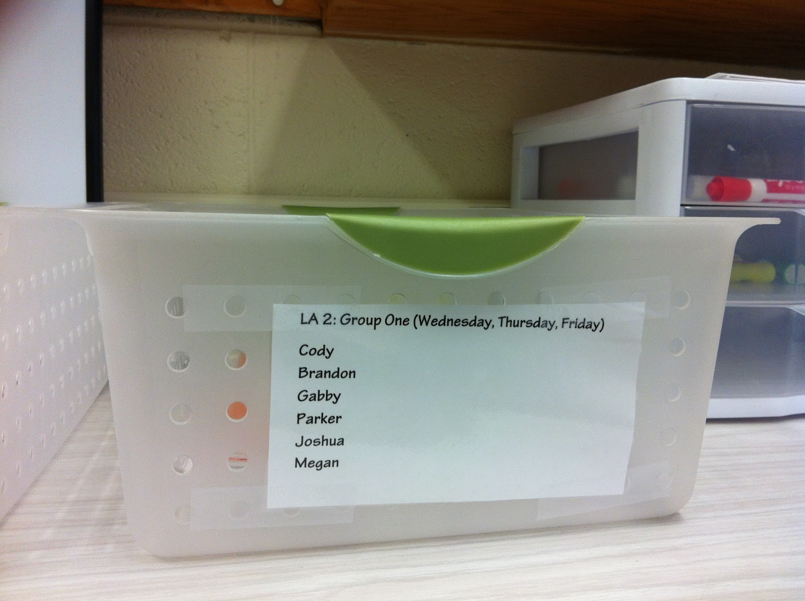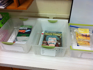 Since all three of the 6th grade teachers will have guided reading groups at the same time that I will, I am going to be utilizing the guided reading table in my office.  Therefore, I have been busy over the last couple of days transforming my office into a functioning guided reading space for the 2 guided reading groups that I will have throughout the week in the morning, and the three guided reading groups that I will have throughout the week in the afternoon.  Below are pictures of the space and organizational ideas that I’m going to be trying out.