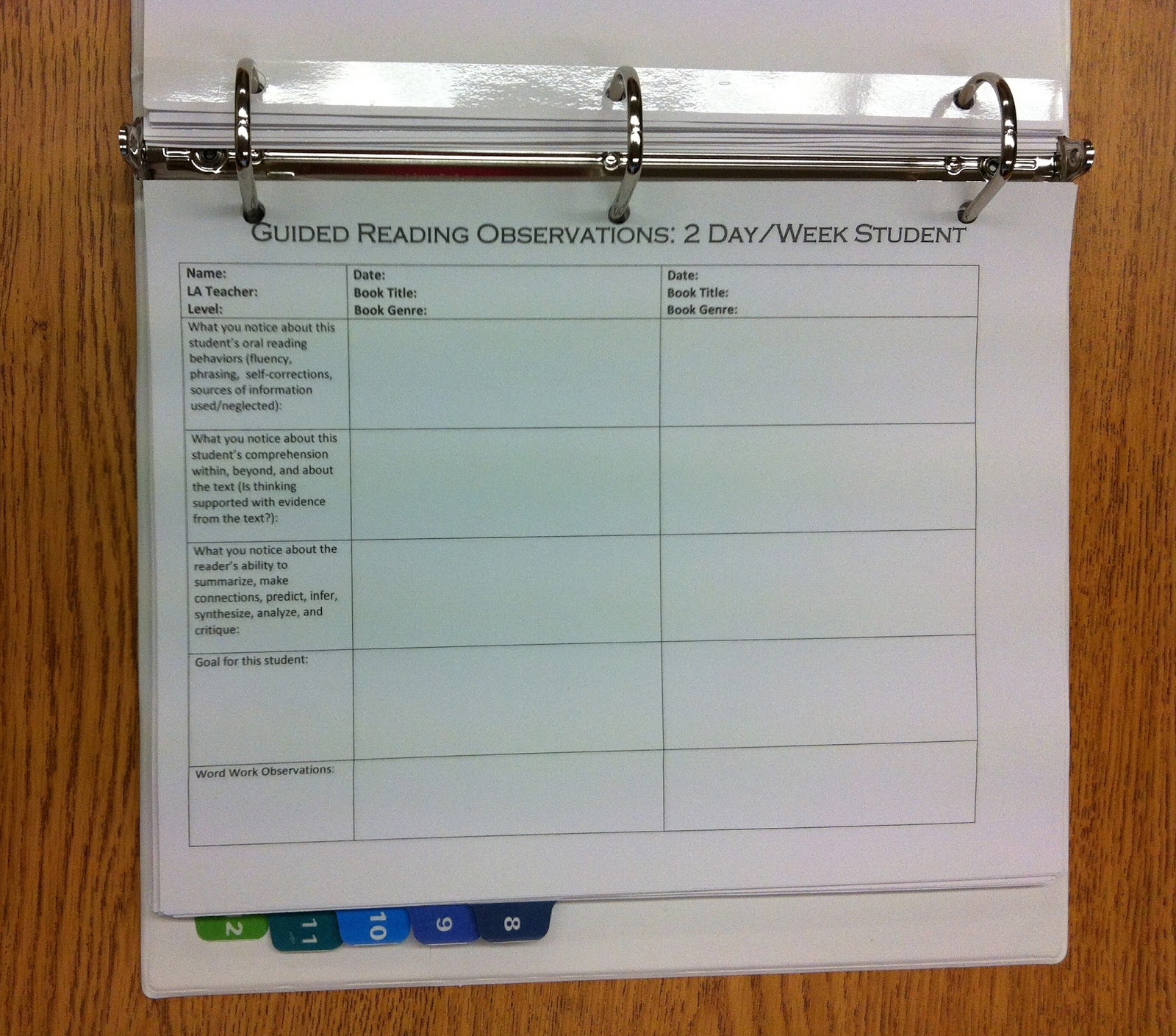 This tab of my guided reading binder contains blank guided reading lesson planning templates.