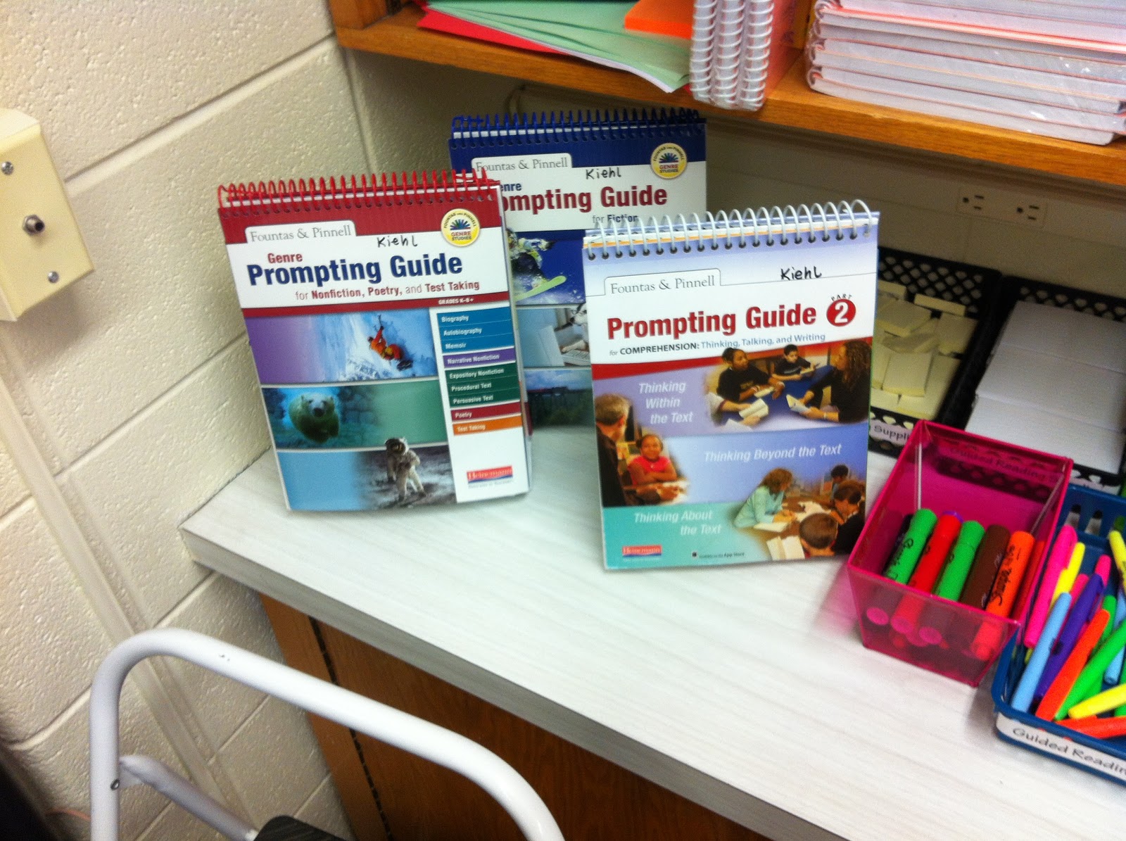 The next area of my guided reading haven is the supply area.  In this area I keep pens, Sharpies, highlighters, chart paper markers, white board with markers and erasing spray, tape, post-its, index cards, and prompting guides.  It’s important during a guided reading lesson that every instructional minute is put to good use.  There is no time for students to run to their lockers or for me to fiddle around my office looking for a supply that I need.  by having the materials organized and right on hand, it just ensures that the flow of the guided reading lesson will not be interrupted by anything to do with not having supplies.  Also, I am absolutely OBSESSED with the Fountas and Pinnell prompting guides for fiction, non-fiction, and thinking within, beyond, and about the text.  I use these all the time, depending on which reading goals I have for students that day.  Having prompts ready to use at a glance focused toward a specific skill is so helpful for reading instruction.  I highly recommend any guided reading teacher get these.  In my opinion, they work great for middle school level students.