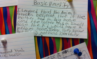 Under the heading, “What I Learned from my Reading,” this student responded to what she learned about heredity from an expository nonfiction text. She summarized her findings in her own words and included the page number where she found the information.