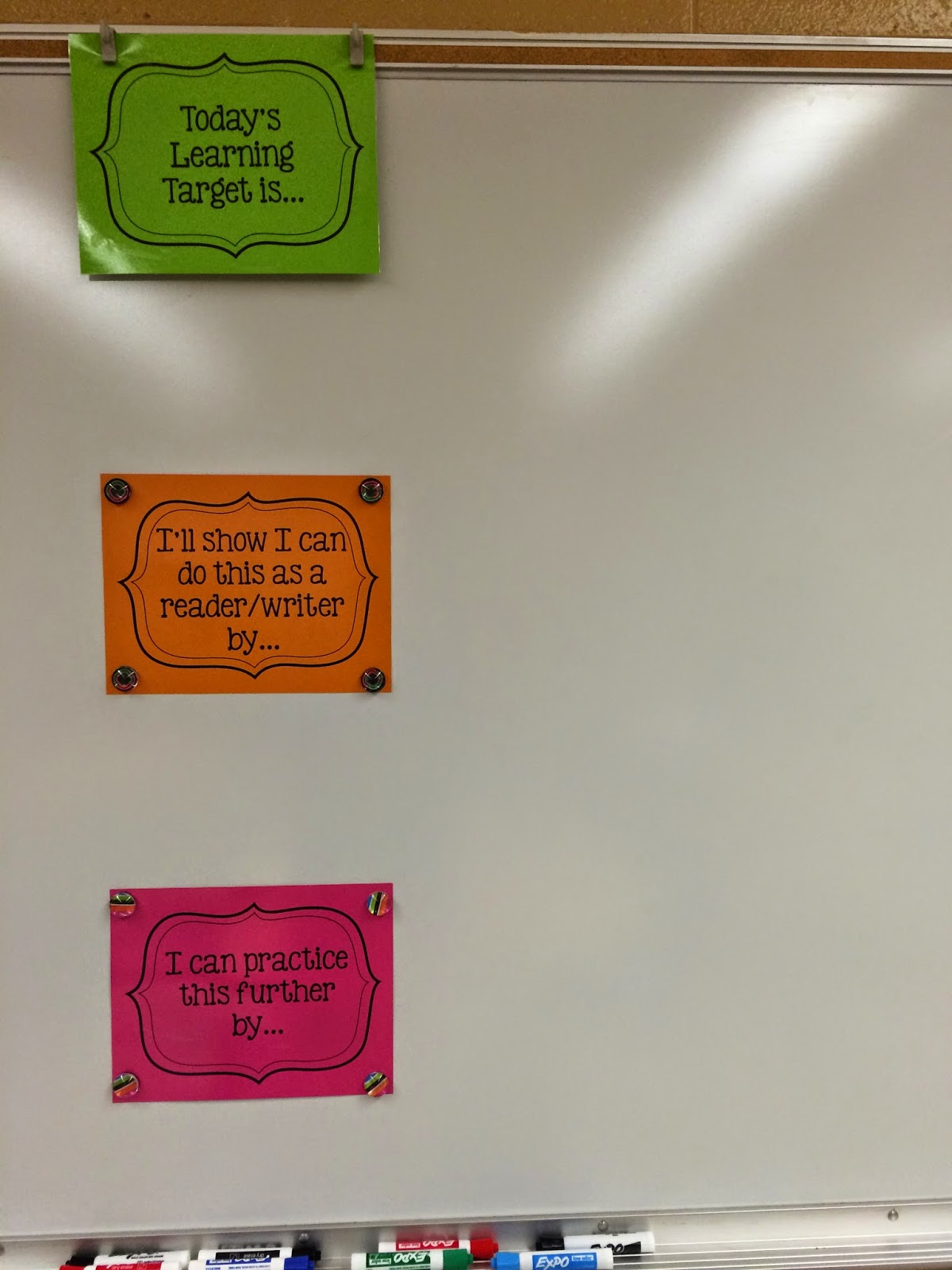 Picture this, your principal walks into your classroom for an informal walk-through and settles into observe for a few minutes.  You’ve got a solid lesson going, so you’re keeping it cool and going on with the lesson.  After awhile, he/she ventures up to one of your students and asks, “What are you learning about today?”  In your mind, you send up a silent prayer to God that your student is able to articulate a clear purpose for the lesson. No matter what you call them: learning targets, focus lesson, minilessons, I can statements, etc., we all are familiar with the need to display the day’s purpose on the off chance that it’s your day to get an evaluation.  But what if I told you that posting learning targets can be more than an indication of your submission to wanting to do well on the walk through feedback form?  Posting a learning target daily begins by getting your mind focused in on what you’d like students to accomplish for the day.  They also clearly communicate with students on what their expectations as a learner are for that day.  This is my first year posting a daily learning target.  I’ve always had minilesson statements incorporated into my lessons, but I have to admit, I’ve found power in posting the day’s learning target in the front of the room for all to see. To the left of my Smartboard, I have my learning target area.